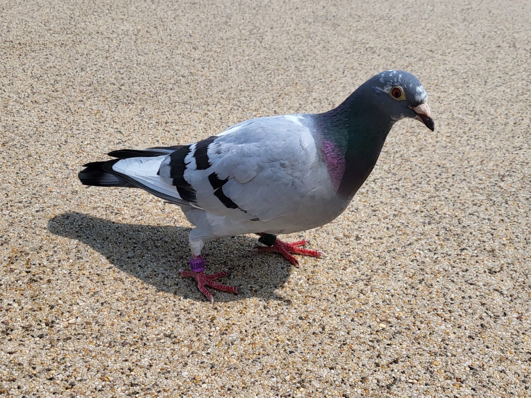 Racing Pigeons will always wear at least one ring. This will be a coloured ring with a series of letters and numbers on it. If they’re partaking in a race, they may also have a solid, dark ring on the other leg as well.